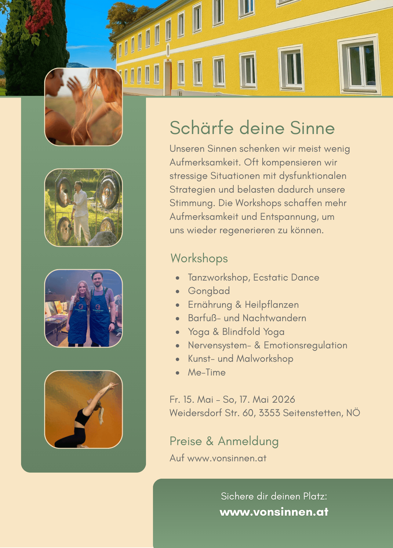 Von Sinnen Weidersdorf Straße 60, Seitenstetten, Niederösterreich, AustriaDas ‚Von Sinnen‘ Retreat bietet dir die Möglichkeit, deine Sinne auf eine neue Art zu erleben und zu beleben. In einer ruhigen und idyllischen Umgebung lernst du, wie du durch gezielte Workshops und Aktivitäten dein Bewusstsein schärfen und dein Wohlbefinden steigern kannst. Unser Ziel ist es, dir Werkzeuge an die Hand zu geben, mit denen du auch im Alltag mehr Achtsamkeit und Freude erfahren kannst. Weitere Infos auf der Homepage oder im angehängten Flyer