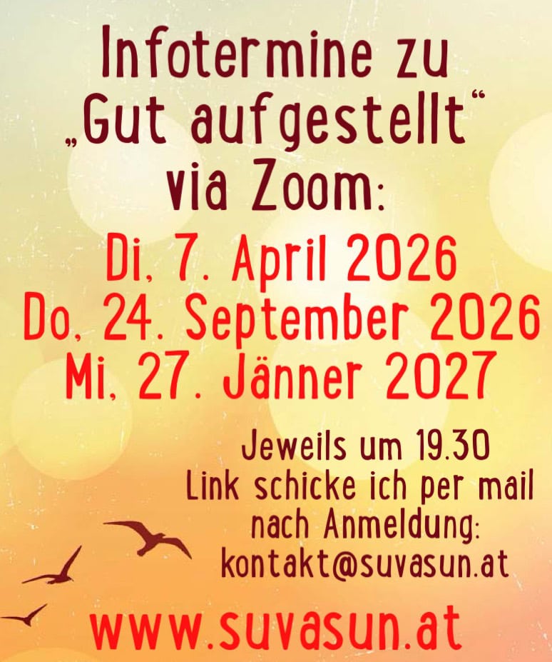 Ich biete seit 13 Jahren Familienaufstellungen an. Details zu mir und meiner Art Aufstellungen zu leiten, gibt es auf: www.suvasun.at Die 4 Aufstellungsplätze sind meist schon 1-2 Monate im Voraus ausgebucht. DarstellerInnenplätze gibt es meist noch spontan! Die systemische Aufstellungsarbeit ist meine Passion, da dadurch verborgene Dynamiken in der Familie, aber auch im Arbeitsumfeld und bei Entscheidungsfindungen, sichtbar und spürbar gemacht werden können. Ich empfehle dazu auch meinen podcast (auf allen üblichen Plattformen gratis erhältlich): "Talk! Gut aufgestellt durch wahre Worte!"
