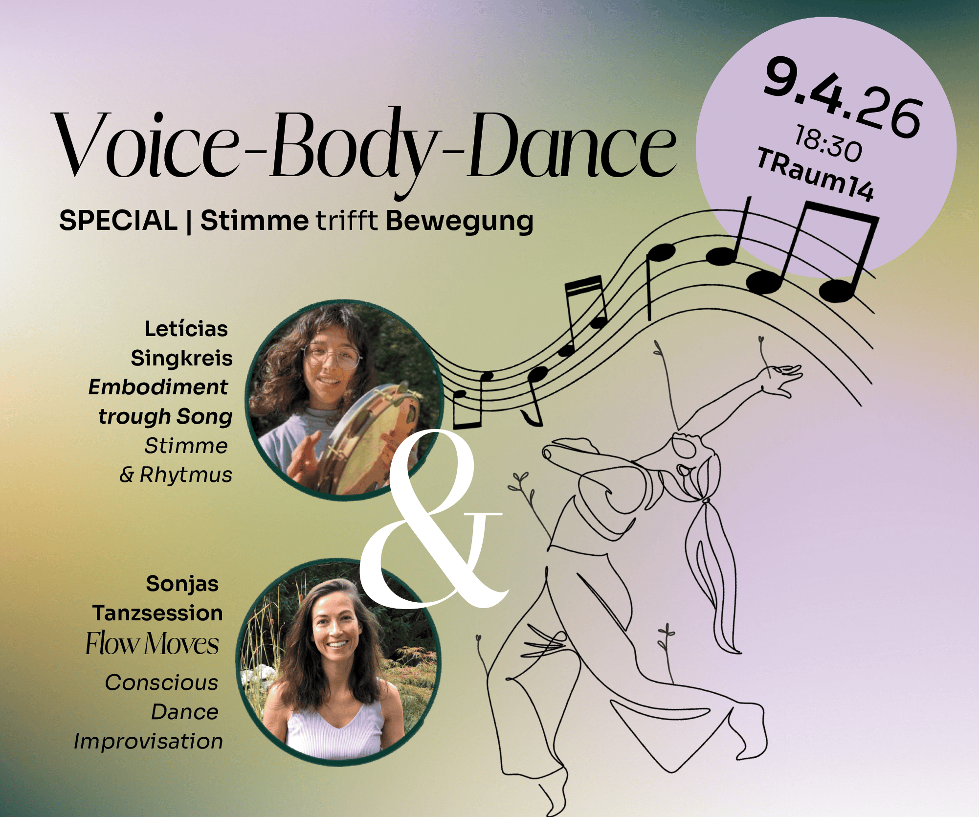 TRaum14 Hauptstraße 29, 1140, Wien, AustriaDu sehnst dich nach Präsenz, Lebendigkeit & Flow? Entdecke Dich im freien Bewegungsfluss. Offener Workshop für CONSCIOUS DANCE IMPROVISATION Themenfokus am 19.3.: GROUNDED - Tanzen am Boden Wie fühlt es sich an, dich vom Boden tragen zu lassen? Erden, Sinken, gleiten, rollen, krabbeln: Wir erforschen geschmeidige Bewegungen am Boden im Solo und im Kontakt. Das Vertrauen, gehalten zu sein. Flow Moves sind Dein Raum für Verbindung mit Dir & mit anderen: Bewusstes Lauschen nach innen Geschmeidiges freies Bewegen Authentischer, kreativer Ausdruck in deiner Vielfalt Achtsame Begegnung im Tanz Offen für alle - Anfänger*innen & Erfahrene willkommen - EveryBody welcome! BEITRAG: 25 € regulär | 10 € Schnupperbeitrag bei 1. Teilnahme Infos & Anmeldung: https://movement.sonja-regen.at/flow-moves