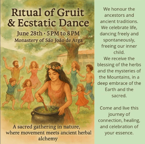 🌀 Kloster São João d'Arga / Caminha, Viana do Castelo, NordportugalArga (Baixo, Cima und São João)Portugal📍 Koordinaten: 41° 50′ 18″ N, 8° 43′ 57″ O 📅 28. Juni🕔 17:00 – 20:00 Uhr Tauche ein in einen magischen Abend, getragen von der Kraft der Natur und der Energie unserer Ahnen – an einem heiligen Ort, der seit Jahrhunderten Menschen verbindet. Wir starten mit dem Gruit-Ritual – einer alchemistischen Verschmelzung aus heilsamen Kräutern und alkoholfreiem Craft-Bier. Danach öffnen wir den Raum für eine Ecstatic Dance Session: freier, authentischer Tanz, der Körper und Seele in Bewegung bringt. 💫 Ein Event für die ganze Familie – mit einem kleinen Betreuungsbereich für Kinder 🌸 🎟️ Beitrag:€18 bei Voranmeldung€20 an der Abendkasse 📲 Mehr Infos & Anmeldung:Schreib uns einfach hier per…