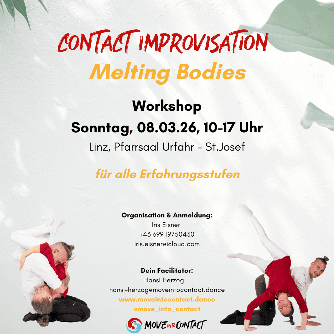 Melting Bodies – Contact Improvisation Workshop mit Hansi Herzog | Move into Contact Sonntag, 08.03.2026 · 10–17 Uhr Linz, Pfarrsaal Urfahr - St.Josef für alle Erfahrungsstufen offen * Wiederholung der Grundlagen * Vertiefende Optionen für Fortgeschrittene * Fokus auf fließende Übergänge * spielerische Übungen zwischendurch Tauche einen Tag lang ein in die Kunst des gemeinsam bewegten Körpers. „Melting Bodies“ lädt dich ein, Weichheit, Flüssigkeit und Übergänge im Tanz ganz neu zu entdecken – vom Boden bis in die Luft, von der Stille bis ins spielerische Momentum. Wir erforschen, wie Körper schmelzen, ineinander fließen, sich tragen, rollen, lauschen und gemeinsam Momentum finden. Hier bekommst du Raum, Technik zu verfeinern, Präsenz zu kultivieren und den Mut zu entwickeln, dich wirklich einlassen zu können – auf dich selbst…